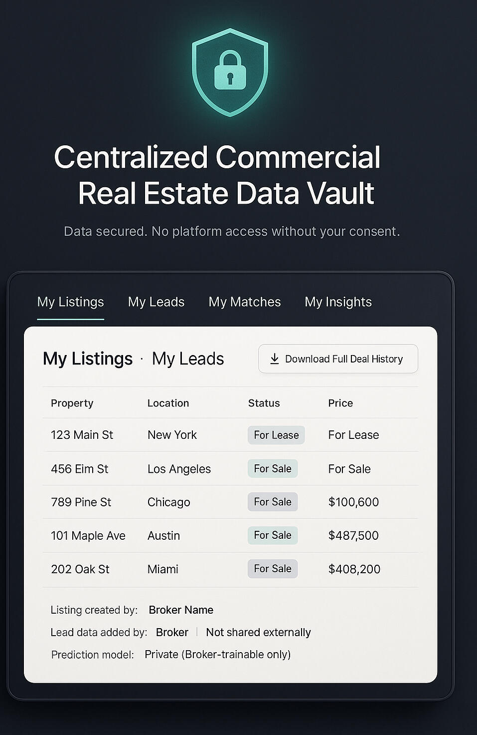 Your AI agent powered command center for smarter prospecting, precision matchmaking, and intelligent deal flow. Built for commercial brokers to close sales and leases faster, with full control.