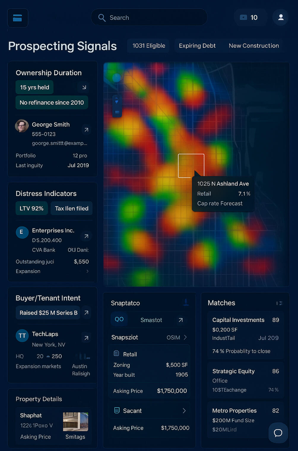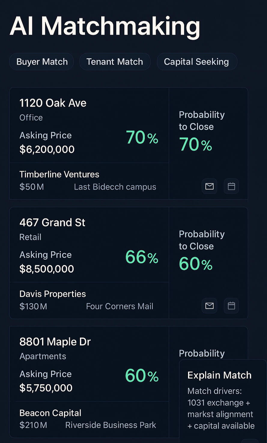 Your AI agent powered command center for smarter prospecting, precision matchmaking, and intelligent deal flow. Built for commercial brokers to close sales and leases faster, with full control.